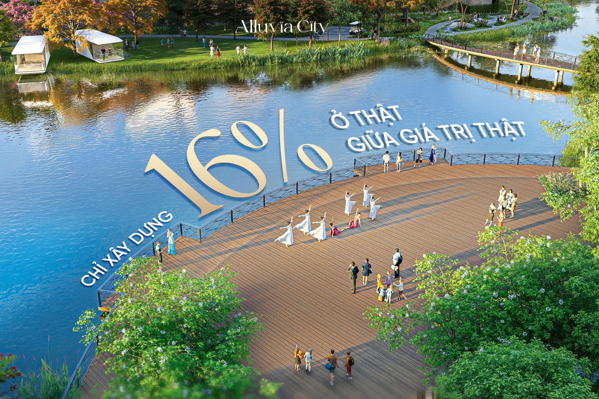 Alluvia City được quy hoạch từ nguyên tắc cốt lõi: Lấy con người làm trung tâm và thiên nhiên làm chủ đạo. Mật độ xây dựng chỉ 16% theo tiêu chuẩn resort cho phép không gian xanh, mặt nước và gió sông trở thành nền tảng của đời sống – nơi cư dân không chỉ “ở”, mà thực sự sống giữa những giá trị thiên nhiên mỗi ngày.
