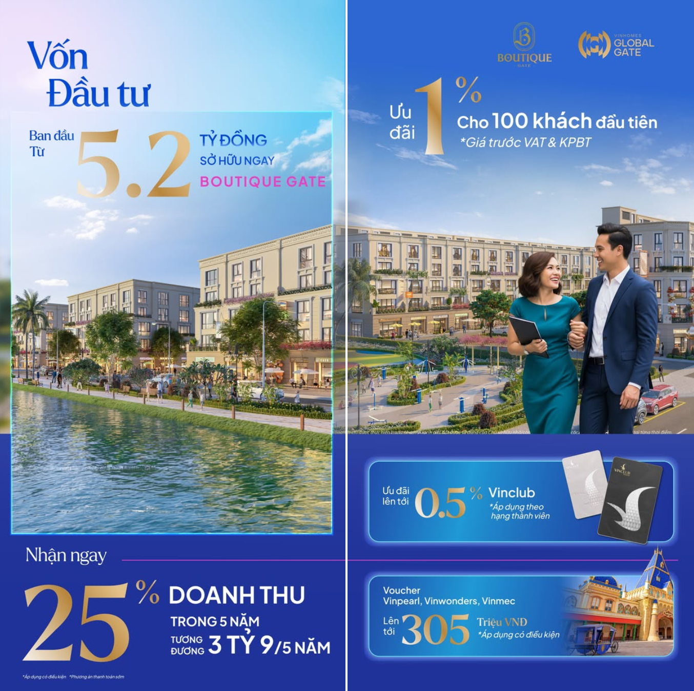Nhận ngay voucher lên tới 305 triệu đồng gồm Vinpearl, VinWonders, Vinmec - Vừa mua bất động sản, vừa “mua” luôn cả hệ sinh thái tiện nghi chuẩn Vingroup. Chọn thanh toán sớm, nắm chắc tiềm năng sinh lời với Boutique Gate - Bất động sản thương mại thấp tầng có khách thật, dòng tiền thật và tiềm năng tăng giá rõ ràng tại Vinhomes Global Gate.