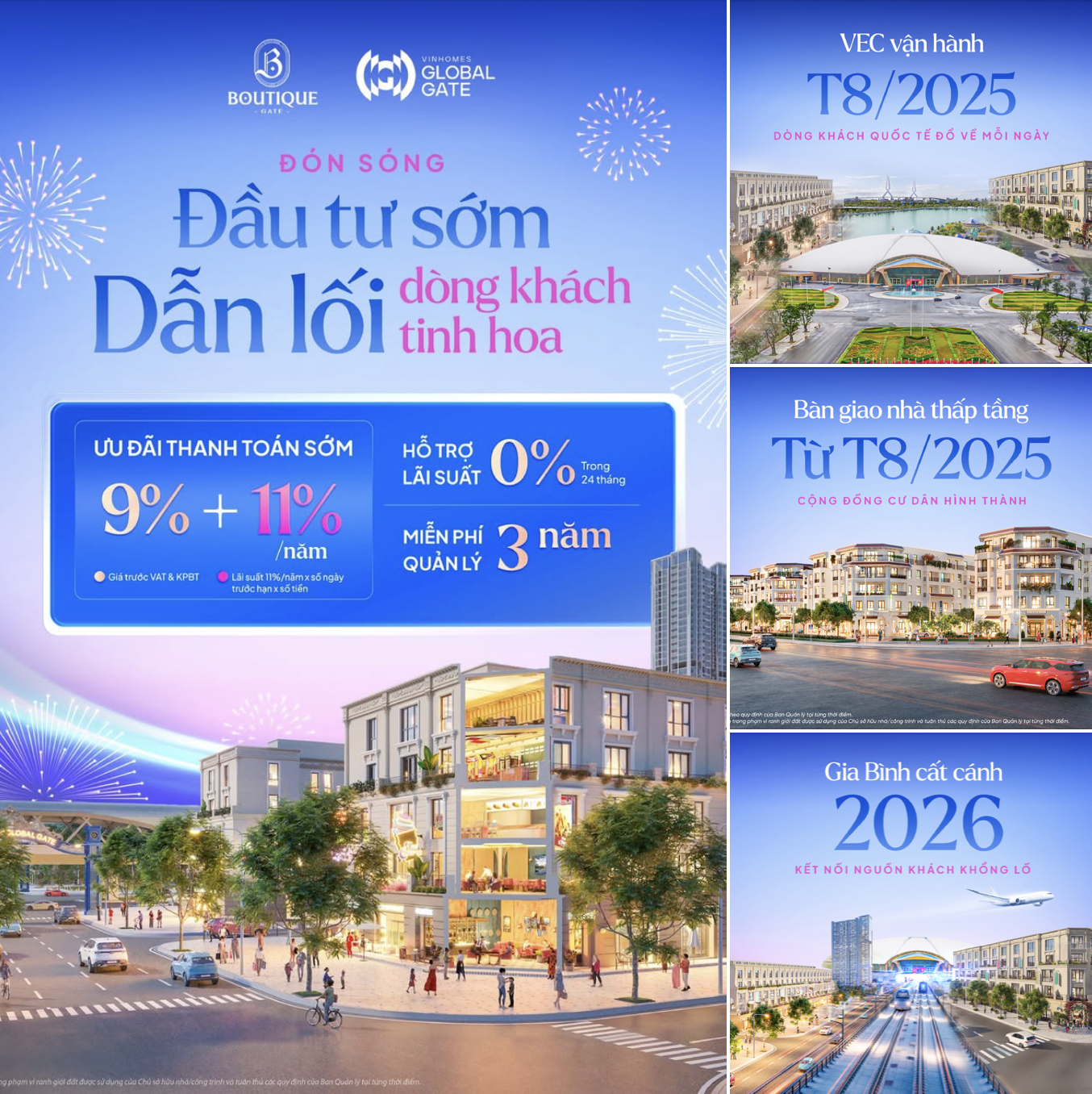 Lý do đầu tư BĐS Thương mại Thấp tầng Boutique Gate ngay hôm nay: Tháng 6/2025, Trung tâm Triển lãm Việt Nam (VEC) chính thức vận hành sau 10 tháng thi công, sẵn sàng đón 60 triệu khách/năm. Tháng 8/2025, hơn 2300 căn nhà thuộc Tinh Hoa - Thịnh Vương - Cát Tường bào giao, cộng đồng cư dân hình thành. Đường Trường Sa kết nối bộ đôi sân bay Nội Bài và Gia Bình tạo trục giao thương lớn hút dòng khách khổng lồ trong và ngoài nước.