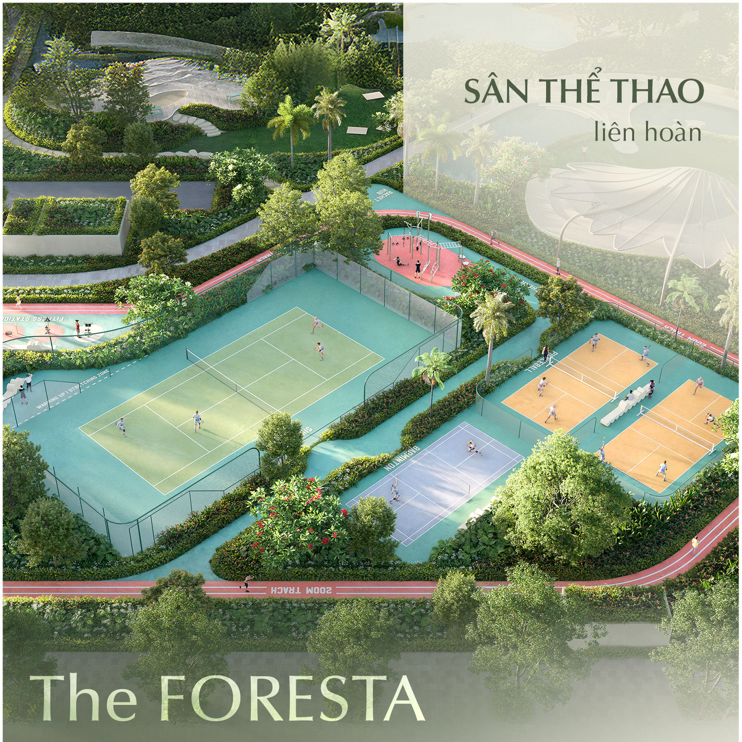 Bên thềm nhà, The FORESTA là sự hài hòa giữa tiện ích và cảnh quan, sự tỉ mỉ trong lựa chọn và sắp đặt các khu vực chức năng mở ra muôn vàn trải nghiệm sống động: bước sải khỏe khoắn trên đường chạy bộ; những cú chuyền bóng mạnh mẽ tại sân tennis, cầu lông, pickleball; chuyển động chậm rãi tại khu thể thao cho người lớn tuổi; hay những bước nhảy đầy hứng khởi tại các công viên chủ đề, khu vận động cho trẻ em.