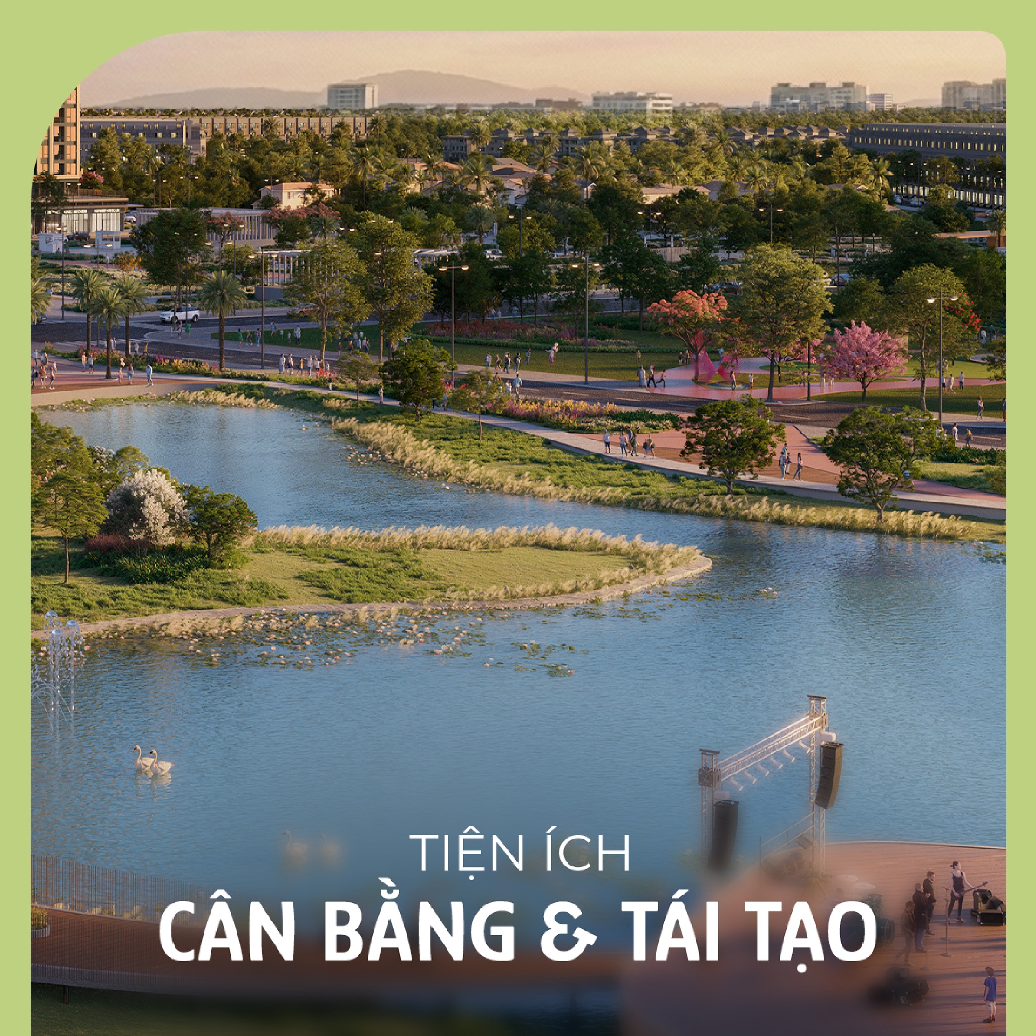 Công viên trung tâm 3,6 ha cùng hệ cảnh quan, công viên và vườn cảnh quan đan cài giữa các tòa nhà trở thành nơi nhịp sống chậm lại, để cư dân thả lỏng tâm trí, hít thở bầu không khí trong lành, dạo bước giữa sắc xanh hay tận hưởng những phút giây an yên hiếm có giữa đô thị.