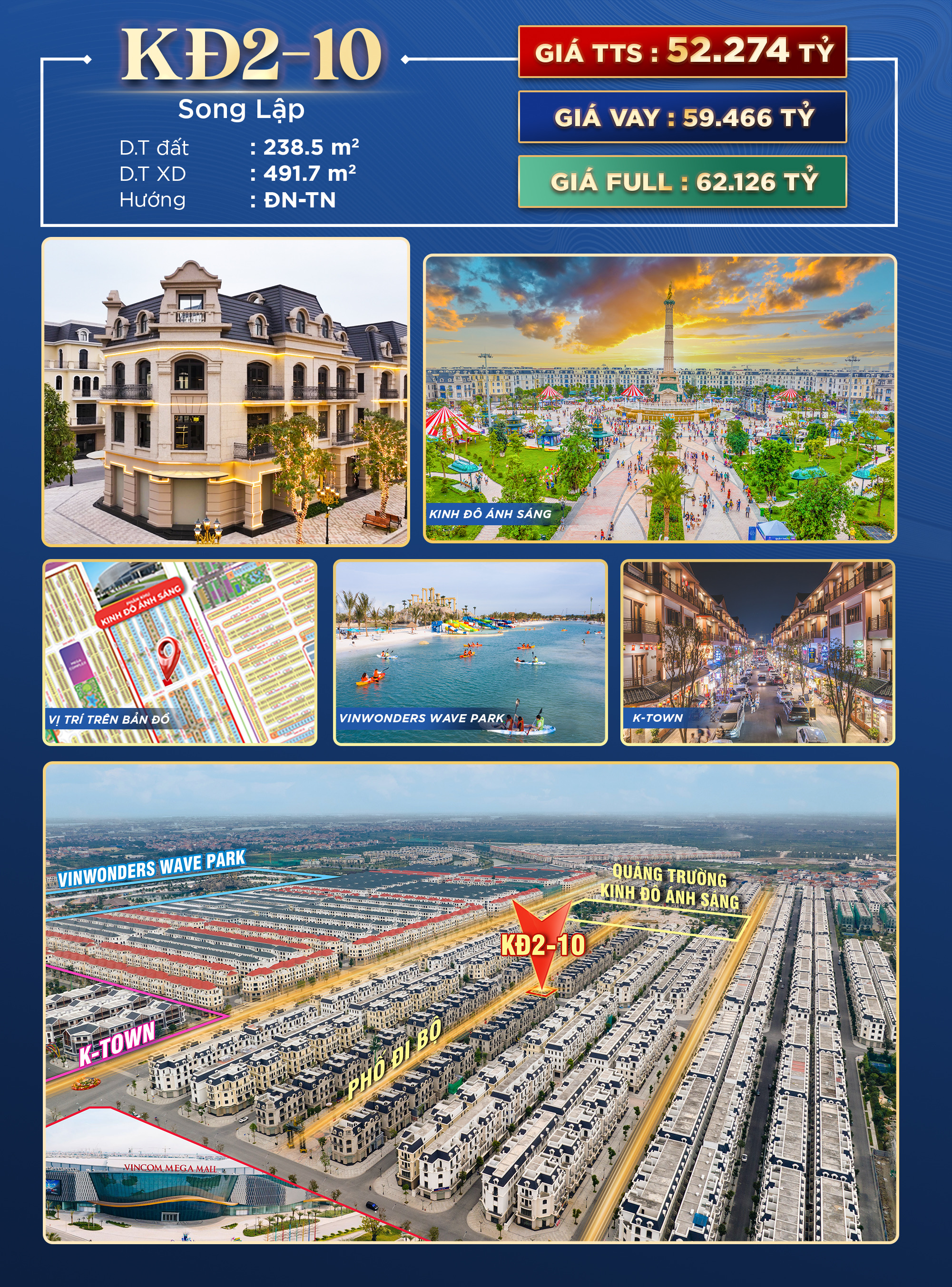 Bạn đang tìm kiếm một không gian sống thượng lưu giữa lòng “thành phố biển hồ” đẳng cấp quốc tế, KĐ2-10 chính là lựa chọn lý tưởng. Nằm tại phân khu Kinh Đô, căn song lập sở hữu vị trí vàng ngay cạnh Quảng trường Kinh Đô Ánh Sáng và chỉ vài bước tới VinWonders Wave Park, K-Town và Vincom Mega Mall.