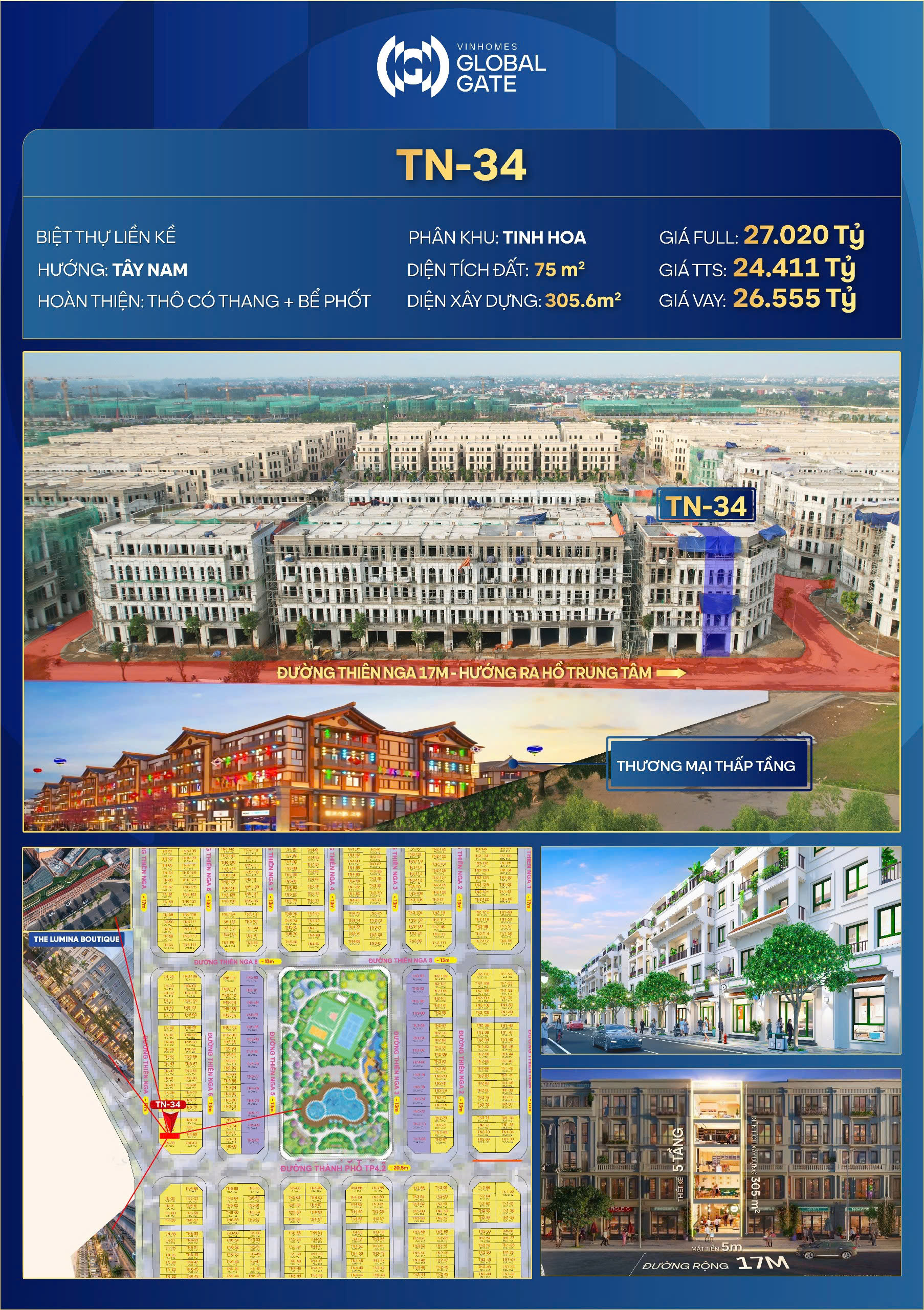 Vị trí đắc địa: Nằm trong Phân khu Tinh Hoa, một trong những phân khu đẹp nhất dự án. Căn TN-34 tọa lạc trên mặt đường rộng 17M, hướng ra hồ trung tâm, đảm bảo tiềm năng kinh doanh và giá trị gia tăng vượt trội.